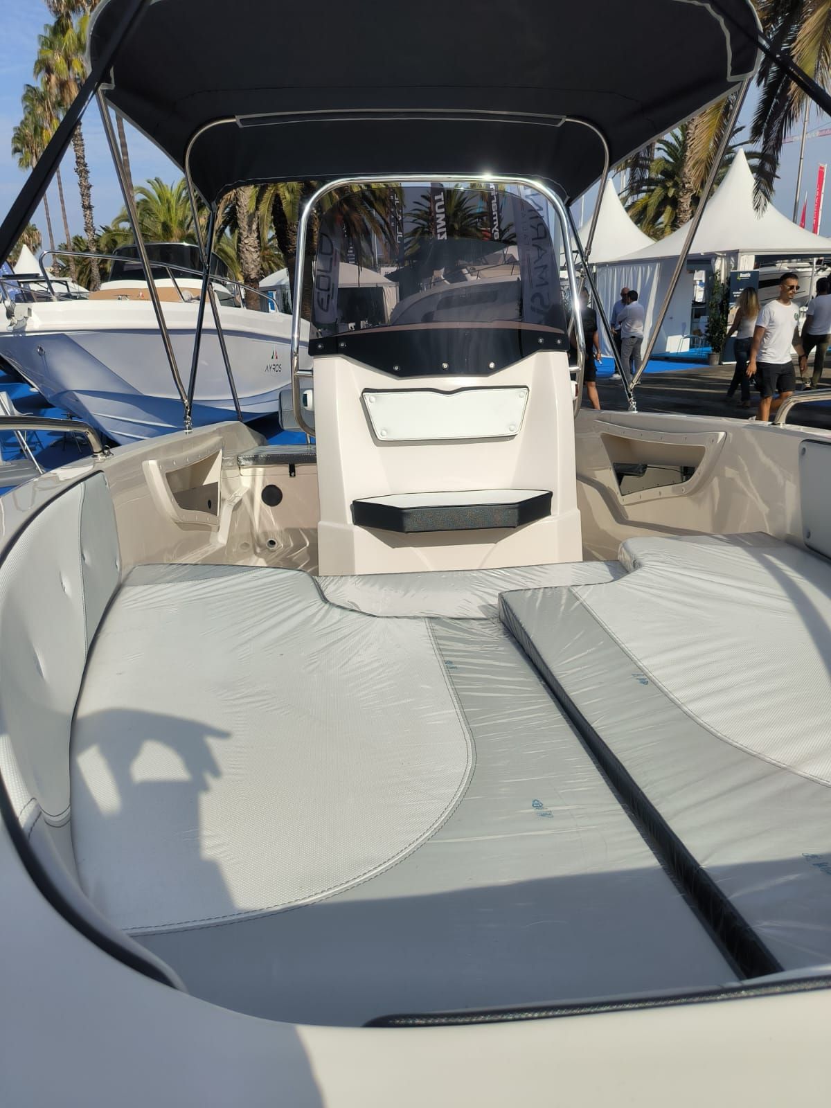 - Solarium de proa con colchonetas y respaldos tapizados.
