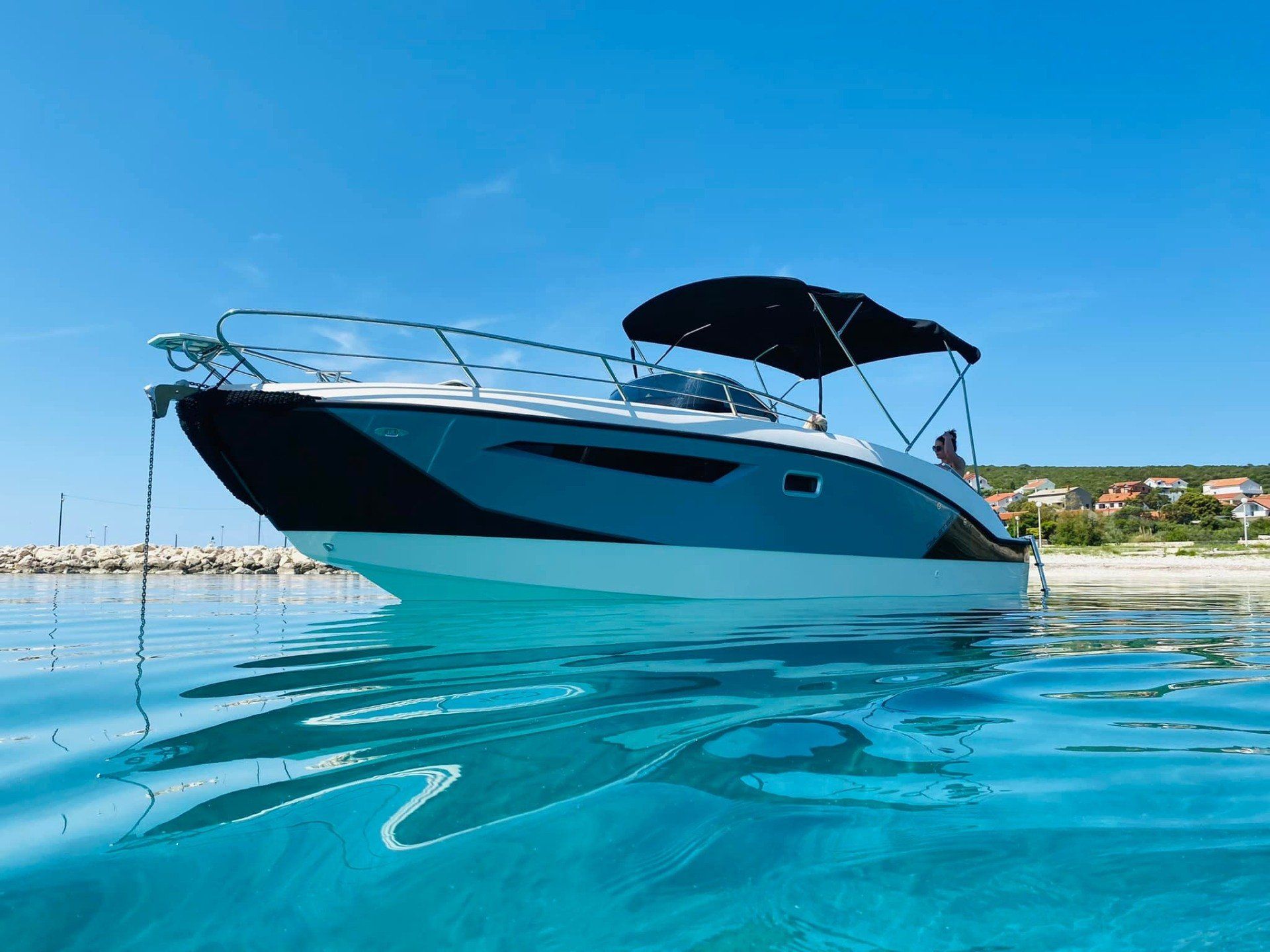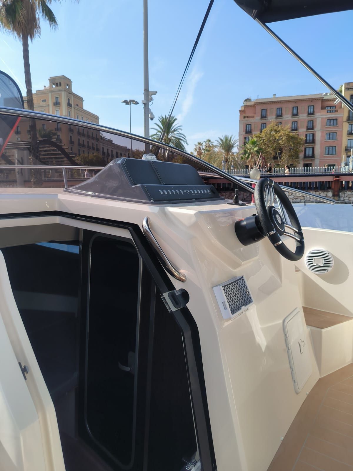 - Balcón de proa abierto con base pisable para acceso al barco.